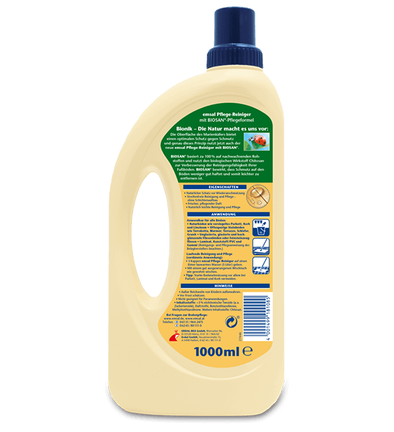 Der emsal Pflege-Reiniger kombiniert sanfte Pflege mit zuverlässiger Reinigung. Dank seiner innovativen BIOSAN®-Technologie reduziert er die Anhaftung von Schmutz und sorgt für eine mühelose Entfernung alltäglicher Verunreinigungen. Gleichzeitig hinterlässt er einen frischen, angenehmen Duft und schützt die Böden vor schneller Wiederanschmutzung – ganz ohne Schichtenbildung.