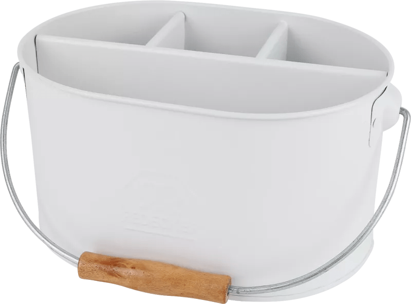 Der weiße Träger ist aus stabilem Metall gefertigt und mit einem angenehm zu greifenden Holzgriff ausgestattet. Die innere Unterteilung bietet auf der einen Seite mehrere fest integrierte Fächer für kleinere Gegenstände wie Reinigungsflaschen, Besteck, Kräuterschilder oder Küchenutensilien. Auf der anderen Seite befindet sich ein größeres, durchgehendes Fach – perfekt für größere Flaschen, Pflanzenhilfen oder Grillzubehör.